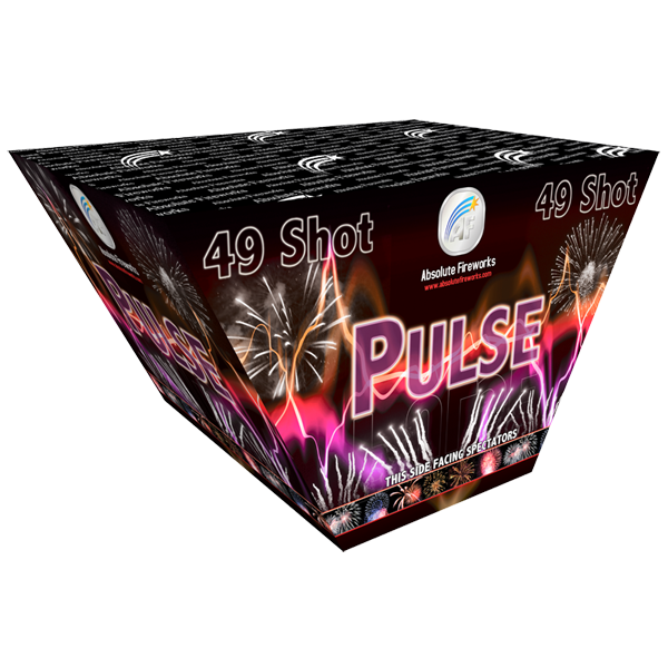 Absolute Fireworks brought display quality timing and effects to the public with the AF49 PULSE. A fantastic 49 Shot Fan Cake launching Red Glitter Brocade crowns with silver glitter tails and red and white glitter lift mines! You have to see this firework to appreciate it's intensity and scale.