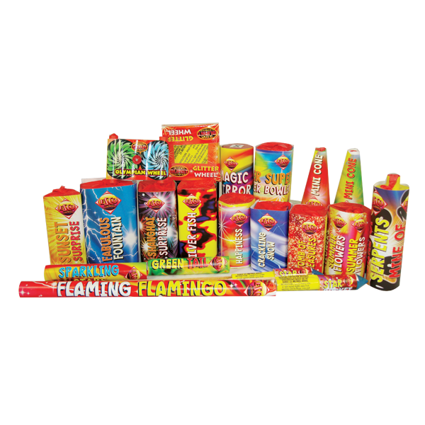Selection Box containing 19 Fireworks including a mixture of Roman Candles, Fountains, Mines and Shot Cakes.