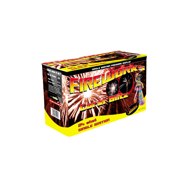 A dazzling 24 shot cake with red chrysanthemum bursts, multi-coloured glitter bursts and purple starbursts, with a stunning finale of glitter and delay crackle bursts.