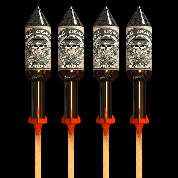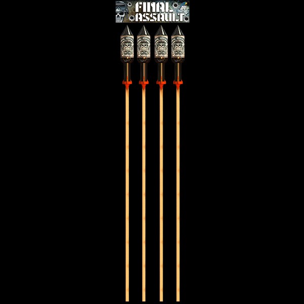 Final Assault is an amazing pack of 4 display quality rockets, each with a different effect. Using technology directly from professional displays, this rocket pack boasts effects such as brocades, strobes, pistils and so much more. Pack also features our proven and patented Flip-stick along with Easy-open mesh making these massive rockets suitable for 1.4G storage. CE Marked.