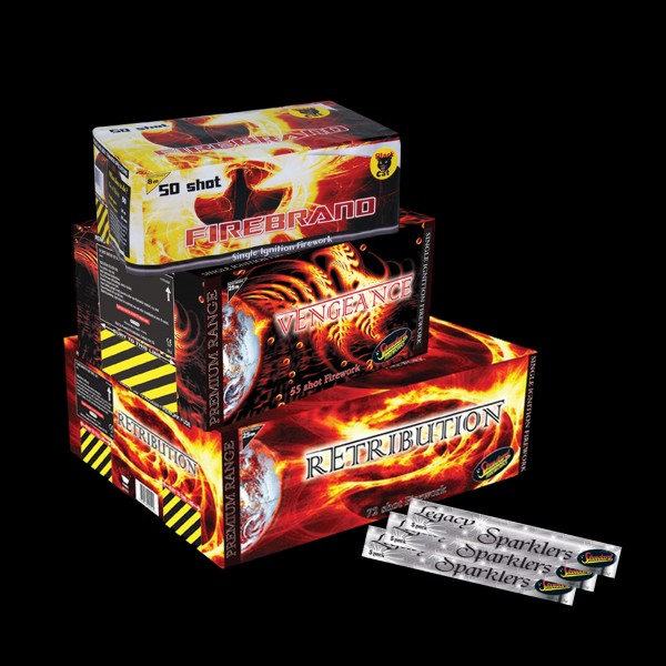 1 x Retribution (72 shots), 1 x Vengeance (55 shots), 1 x Firebrand (50 shots) and 3 x Packs of Medium Sparklers