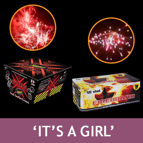 A combination of 'Pink / Red' related outdoor firework products to help you reveal the gender as a 'Girl' with a discounted bundle.