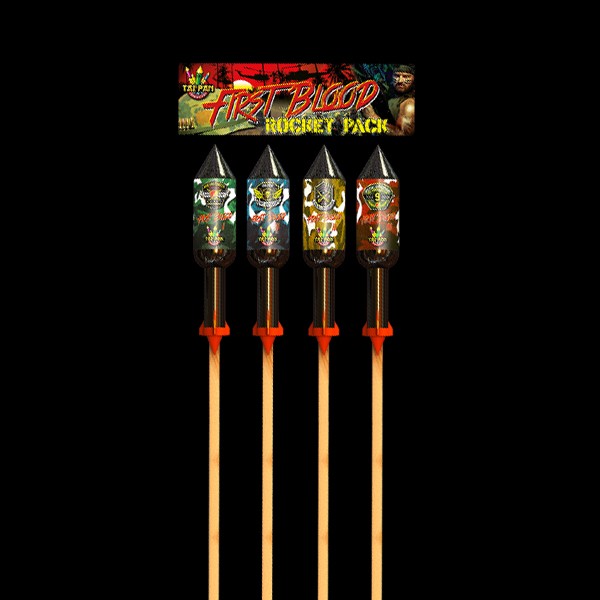 First Blood is a pack of 4 gigantic rockets with effects and bursts to match! Dazzling Red & Silver Glitter, Crackling Brocade, Multi-coloured Pistil and an amazing shaped effect rocket makes this a stunning rocket pack. Packed in resealable Mesh.